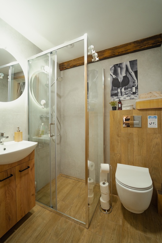 - łazienka z kabiną prysznicową i WC, suszarka, kosmetyki,