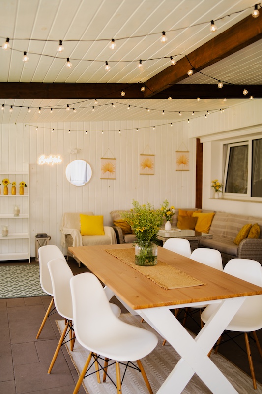 - duży stół, komplet wypoczynkowy, krzesła, kocyki polarowe,